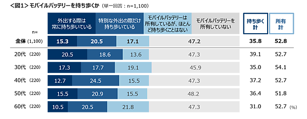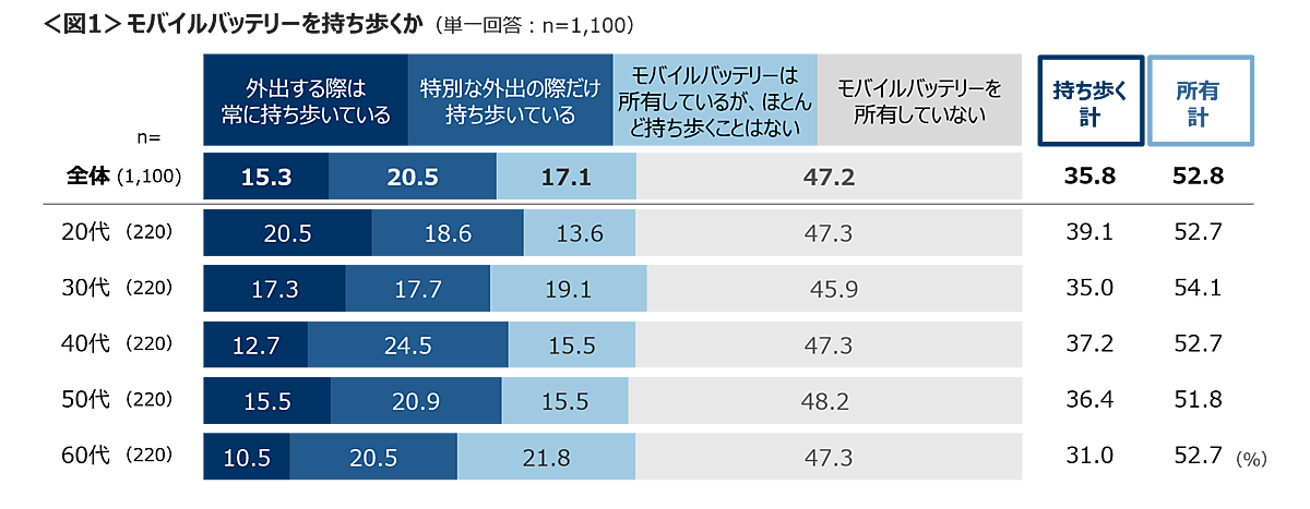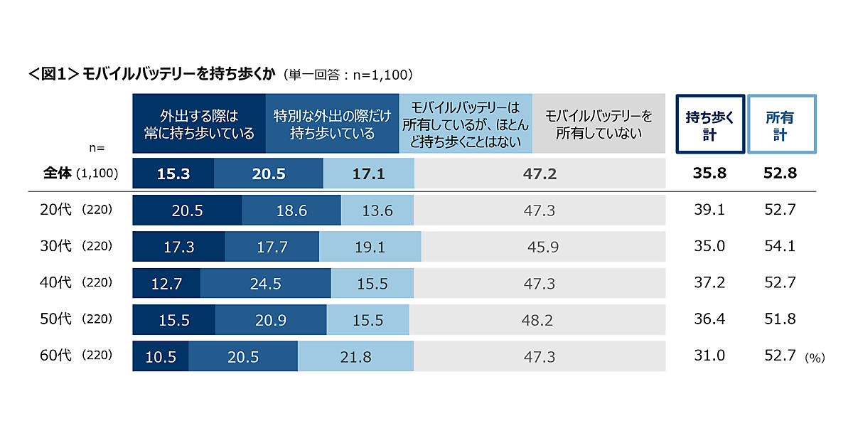 まず「モバイルバッテリーの所有率・利用率(持ち歩き率)」について聞くと、「所有している人」は52.8%で、「外出する際は常に持ち歩く」人は15.3%、「特別な外出の際だけ持ち歩いている」20.5%と、所有率5割超・利用率3割超だった。年代別で見ると、20代の所有率は20.5%と高いが、逆に利用率はそこまで高くない。