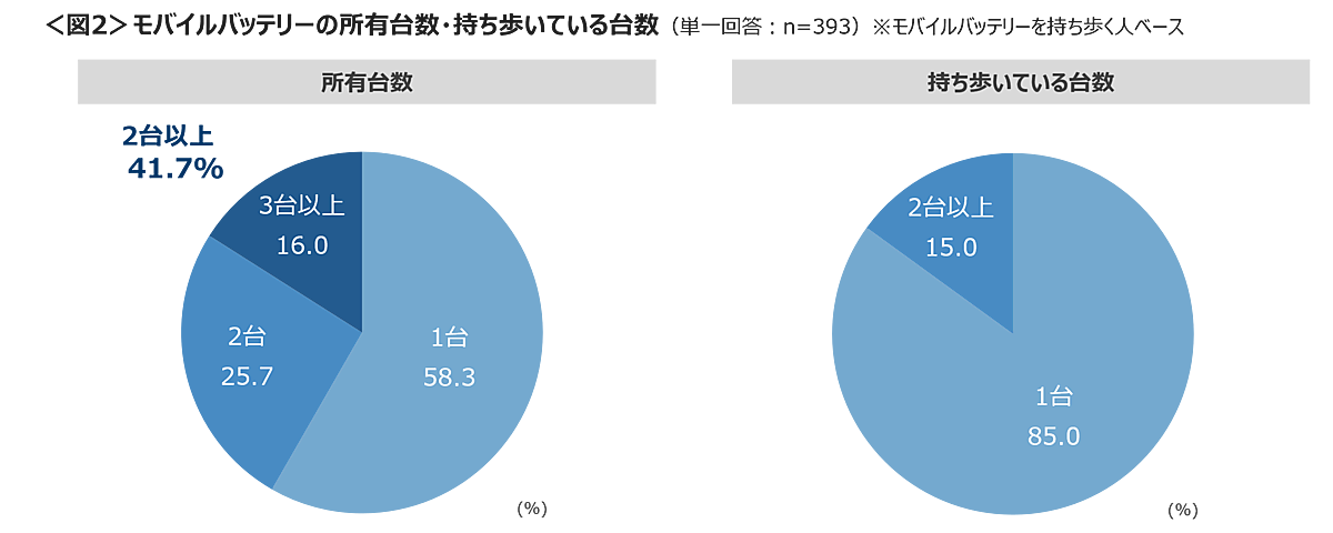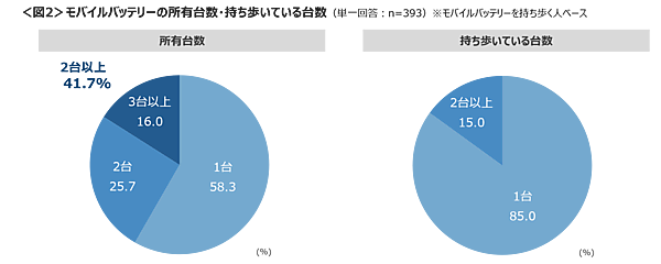 「所有しているモバイルバッテリーの数」「持ち歩くモバイルバッテリーの数」を聞くと、所有台数は「1台」58.3%が最多。持ち歩く台数も「1台」85.0%が最多だが「2台以上」という人も15.0%存在する。