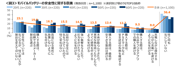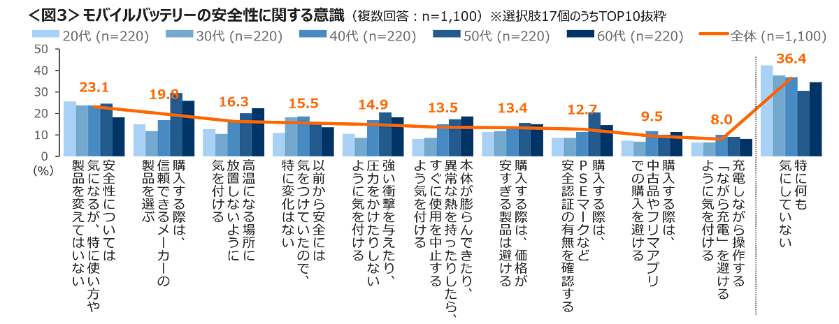 ここ最近モバイルバッテリーの発火や膨張などのニュースが多いが、こうしたニュースに対する感想としては「特に何も気にしていない」36.4%が全体で最多で、「安全性については気になるが、特に使い方や製品を変えてはいない」23.1%が続くなど、注意意識の欠如が目立つ。