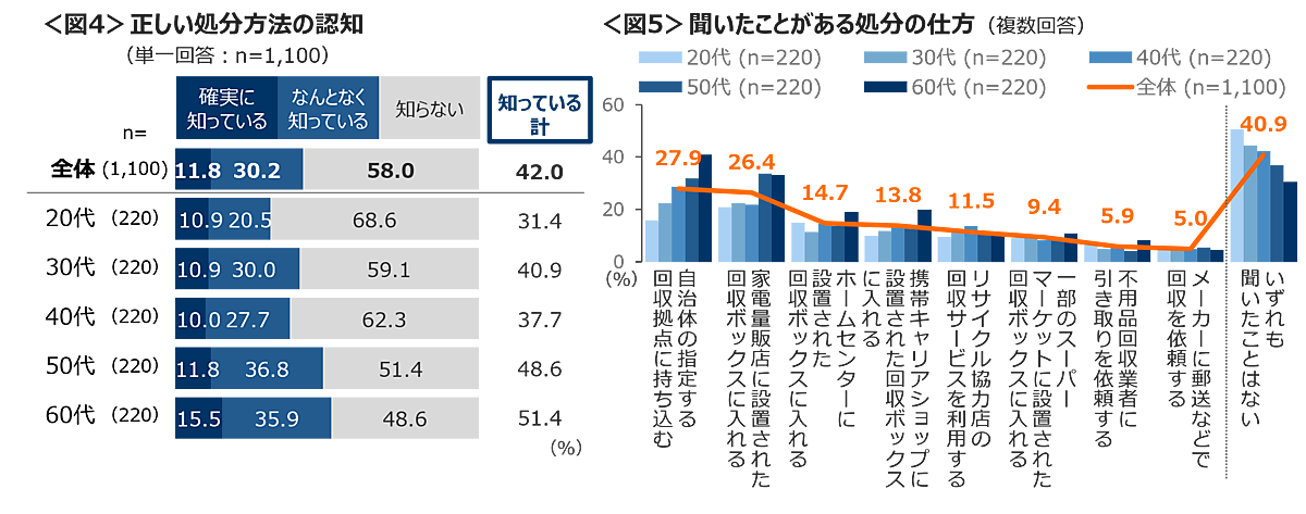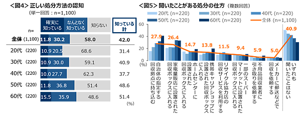 さらに処分方法について聞くと、「確実に知っている」人は11.8%、「なんとなく知っている」人は30.2%にとどまる。また年代が低いほどモバイルバッテリーの処分方法を知らない人が多く、20代では7割近くが処分方法を知らなかった。