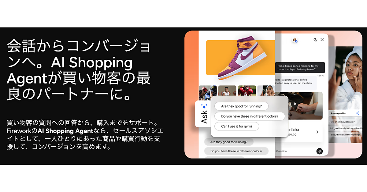 動画コマースとライブ配信ソリューションのFirework Japanは、AI(人工知能)を活用した「AI Shopping Agent」を本格展開すると11月10日に発表した。ECサイトの商品詳細ページ(PDP)を「静的ページ」から「店舗のような接客体験を提供するページ」にする。顧客はページを離れることなくチャットで質問し、動画・テキスト・レビュー・製品情報を組み合わせた回答をリアルタイムで受け取って購入の意思決定をスムーズに完結できる。