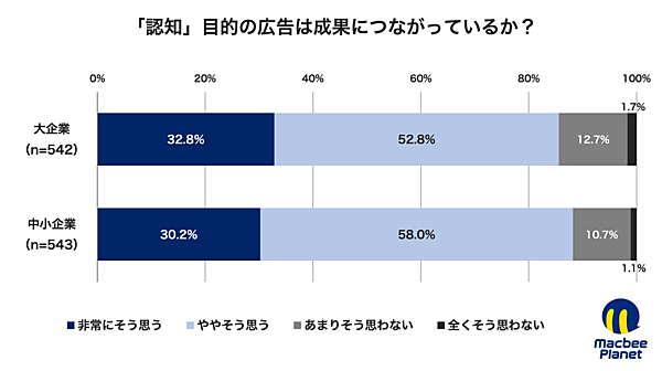 「認知目的の広告は成果につながるか」については、大企業で85.6%、中小企業で88.2%が「そう思う」(非常にそう思う+ややそう思うの合計)と回答。同時に「認知広告は評価が難しい」の割合はほぼ9割に達している。