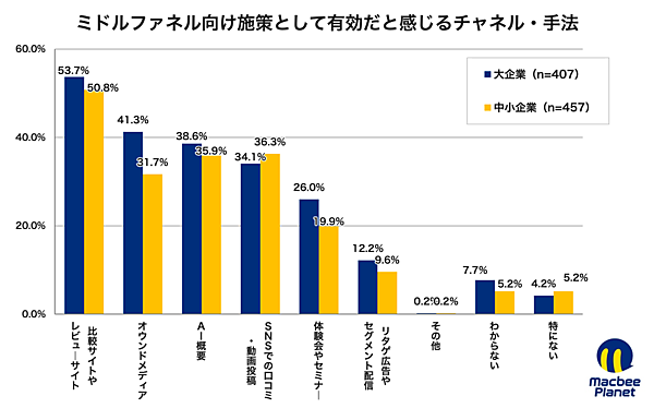 そこで比較サイト、オウンドメディア、SNSクチコミなどで「ミドルファネル施策をどの程度重要視するか」を聞くと、大企業の81.0%、中小企業の78.1%が「重要」(非常に重要+ある程度重要の合計)と回答。ジャンル別では「比較サイトやレビューサイト」を大企業53.7%/中小50.8%が有効であると重視していた。以下「オウンドメディア」「SNSでのクチコミ・動画投稿」「AI概要(検索結果上部のAI要約)」などが続く。