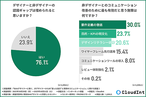 一方で、デザイナーと非デザイナーの認識ギャップは埋められると思うかという質問では、76.1%の人が「はい」と回答。コミュニケーション改善のために最も有効だと思う施策としては、「要件定義の徹底(30.0%)」、「目的・KPIの明文化(23.7%)」、「デザインリテラシー研修(20.6%)」が挙げられた。