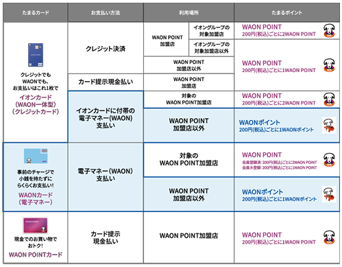 イオンは2016年6月開始の「WAON POINT」をグループ共通ポイントとして統合を進めており、内容の異なるポイント制度が併存する分かりにくさを解消する。現在は電子マネーの「WAON」の利用時に「電子マネーWAONポイント」が付与されるが、統合後はWAON残高へチャージに利用するだけでなく、直接店舗での支払いにポイントを充当できる。