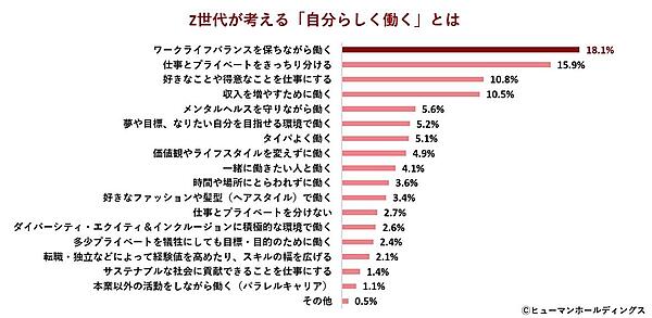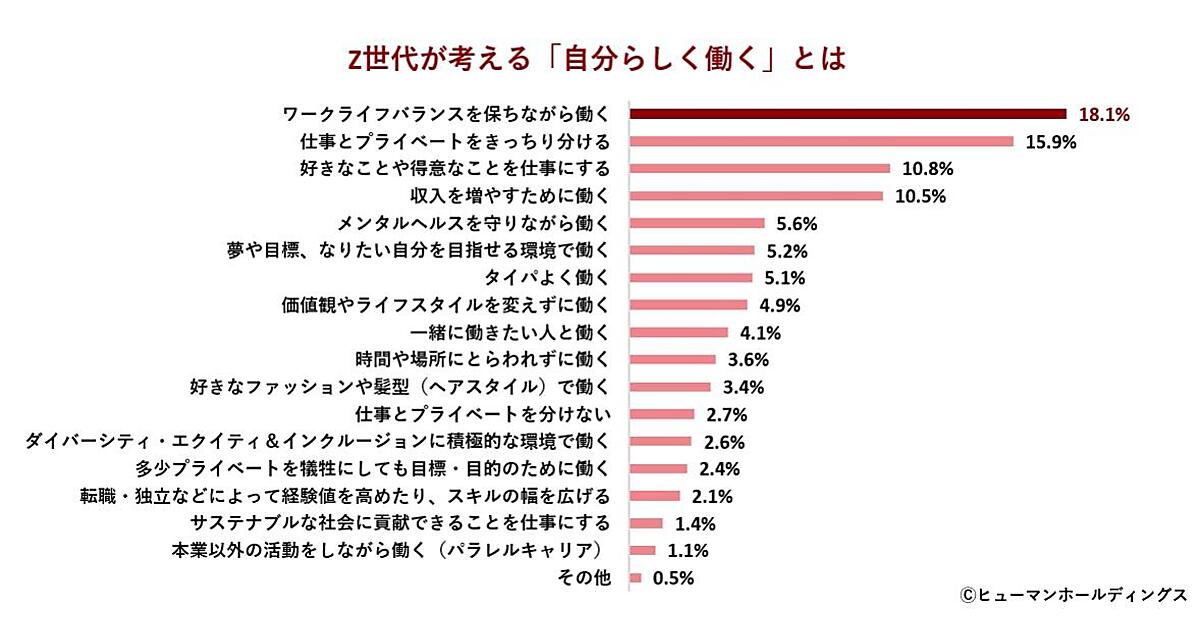 まず「“自分らしく働く”とはどういうことか」と聞くと、「ワークライフバランスを保ちながら働く」18.1%が最多。2位に「仕事とプライベートをきっちり分ける」15.9%があがるなど、“公私のバランス”を重視している様子がうかがえる。以下「好きなことや得意なことを仕事にする」10.8%、「収入を増やすために働く」10.5%が続くが、「メンタルヘルスを守りながら働く」5.6%、「タイパよく働く」5.1%という意見もあがった。