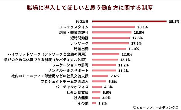 次に「職場に導入してほしいと思う働き方に関する制度」を聞くと、「週休3日」35.1%、「フレックスタイム」20.1%、「副業・兼業の許可」18.5%、「短時間勤務」17.8%、「テレワーク」17.3%が上位。