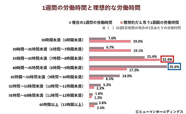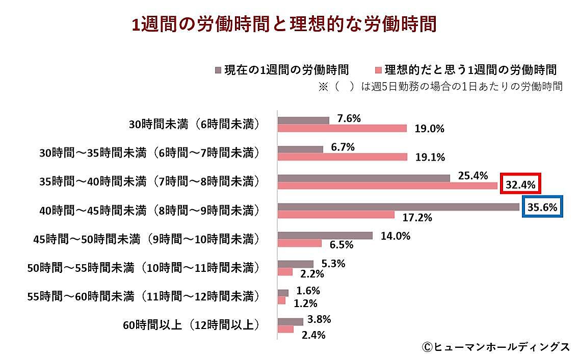「現在の1週間の労働時間」は、「40時間~45時間未満」35.6%が最多で、「35時間~40時間未満」25.4%。「理想の労働時間」について「35時間~40時間未満」32.4%が最多で、「30時間~35時間未満」19.1%、「30時間未満」19.0%が続く。
