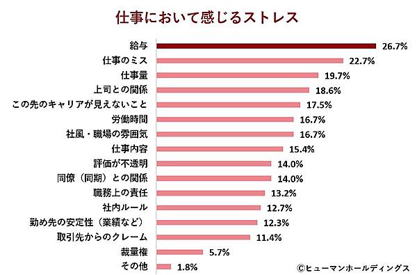 一方で「仕事において、ストレスを感じること」を聞くと、「給与」26.7%が最多で、「仕事のミス」22.7%、「仕事量」19.7%、「上司との関係」18.6%、「この先のキャリアが見えないこと」17.5%がそれに続く。“公私のバランス”を重視しつつも、報酬はもっと欲しいという本音がかいま見える。