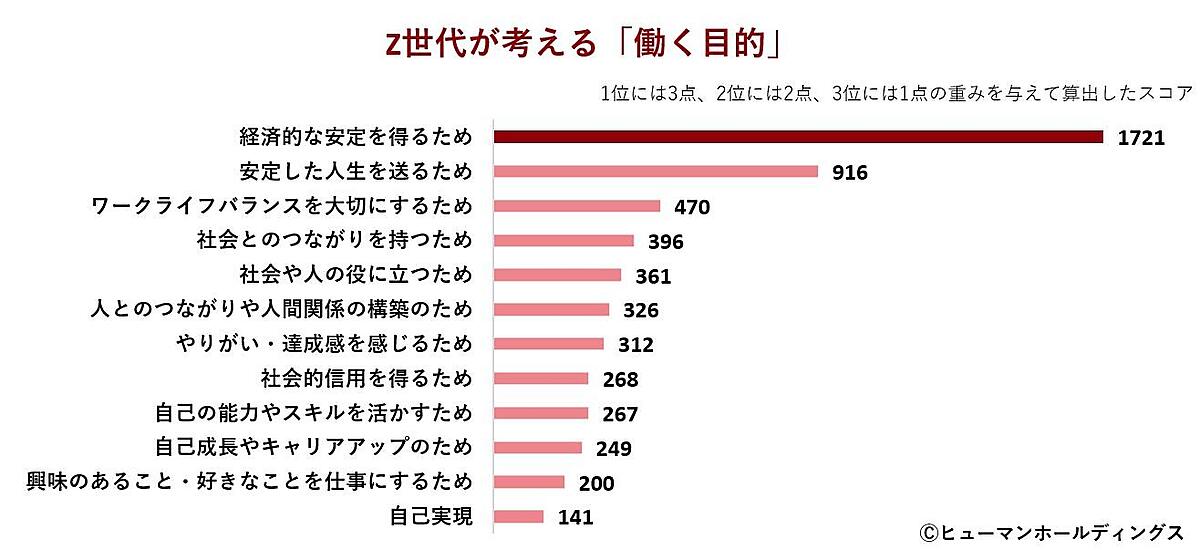 そこで「働く目的は」と切り口を変えると、「経済的な安定を得るため」1721点が圧倒的多数。2位の「安定した人生を送るため」916点と合わせ、多くが“安定”を目的に働いていた。「興味のあること・好きなことを仕事にするため」「自己実現」などは少数にとどまる。