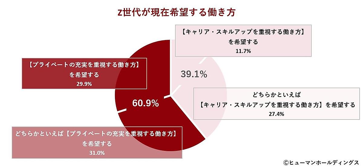 さらに「希望する働き方」を、「キャリア・スキルアップを重視する働き方」と「プライベートの充実を重視する働き方」の選択で聞くと、「プライベートの充実を重視する」(希望する+どちらかといえば希望するの合計)が60.9%で優勢。「キャリア・スキルアップを重視する」は39.1%にとどまっている。