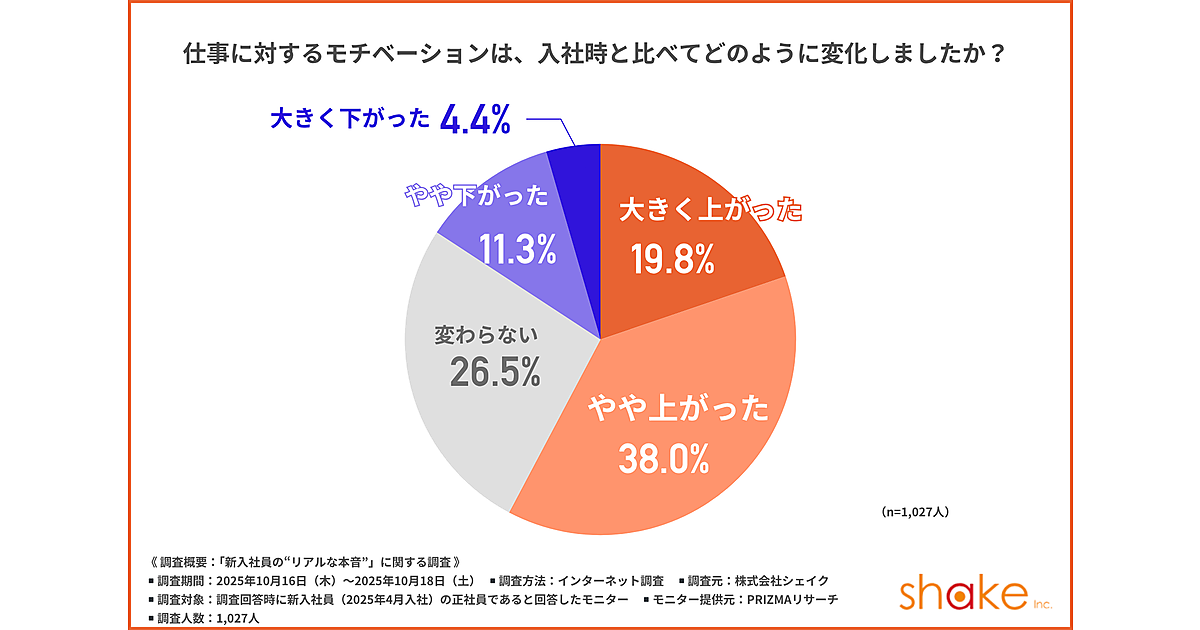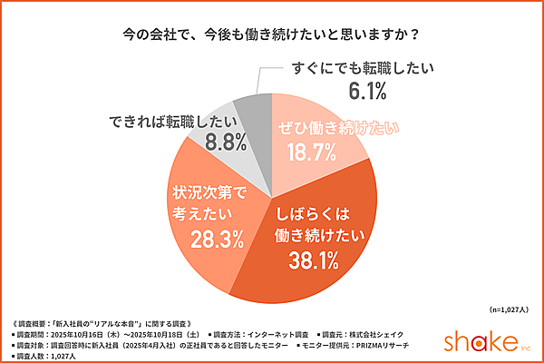 シェイクは、2025年4月入社の新入社員を対象に、「新入社員の“リアルな本音”」に関する調査を実施した。正社員の男女1,027人が回答している。