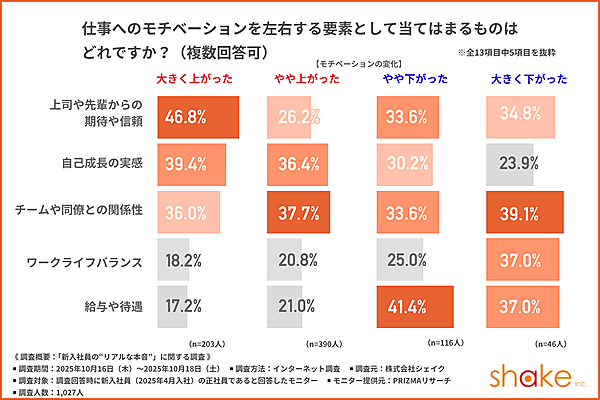 仕事へのモチベーションを左右した要素を聞くと、モチベーションが上がった層では「上司や先輩からの期待や信頼」や「自己成長の実感」が上位に。一方で、モチベーションが下がった層では「給与や待遇」や「ワークライフバランス」などの環境面への不満が挙げられた。また、「チームや同僚との関係性」はどちらの層でも影響力が高いことがわかった。