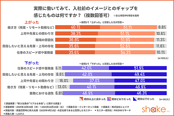 入社前のイメージとのギャップを感じたものを聞くと、モチベーションが上がった層では「働き方(残業・リモート勤務)」や「上司や先輩との関わり方」について「期待以上だった」とする人が多かった。一方で、モチベーションが下がった層では「仕事のスピード感や業務量」や「目指したいと思える先輩・上司の存在」について「期待以下だった」とする人が約半数を占めていた。