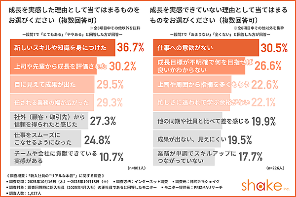 「ある」と答えた人に対し、成長を実感した理由を聞くと、「新しいスキルや知識を身につけた」が36.7%、「上司や先輩から成長を評価された」が30.2%で上位となった。