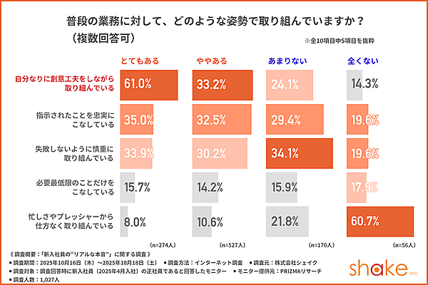 また、普段の業務に対して、どのような姿勢で取り組んでいるかを聞くと、「成長実感がある」人では「自分なりに創意工夫をしながら取り組んでいる(61.0%)」が圧倒的に多い結果に。一方、「成長実感がない」人では「忙しさやプレッシャーから仕方なく取り組んでいる(60.7%)」が突出して多く、日々の業務への姿勢に明確な違いが見られた。