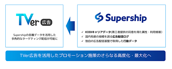 デジタルマーケティング支援のSupershipは、民放公式テレビ配信サービス「TVer(ティーバー)」を展開するTVerと連携してターゲティング広告配信サービスの提供を始めると11月12日に発表した。KDDIのキャリアデータやSupershipが保有する高精度なデモグラデータ(属性情報)やライフスタイル、興味関心などの多様なデータを活用する。