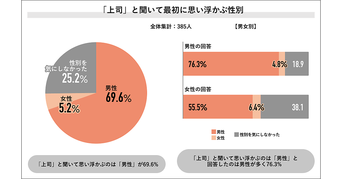 まず「“上司”と聞いて最初に思い浮かぶ性別」を聞くと、「男性」69.6%が過半数、「性別を気にしなかった」25.2%で、「女性」5.2%と大きく差が見られた。