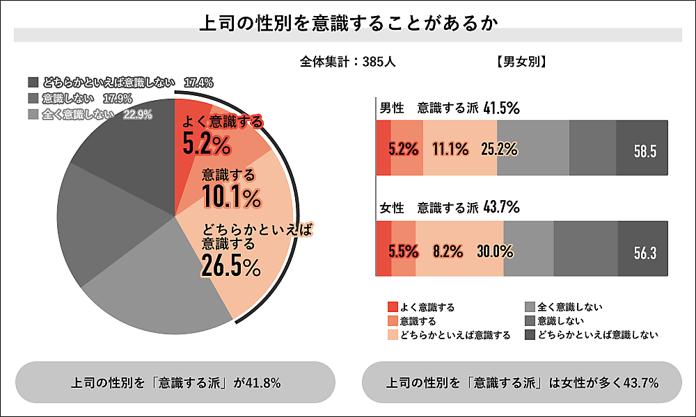 「ふだん上司の性別を意識することがあるか」を聞くと、「よく意識する」5.2%、「意識する」10.1%、「どちらかといえば意識する」26.5%で、「意識する派」が41.8%。「まったく意識しない」22.9%、「意識しない」17.9%、「どちらかといえばしない」17.4%で、総計58.2%とやや「意識しない派」のほうが多い。男女別では、女性が43.7%、男性が41.5%が意識していた。