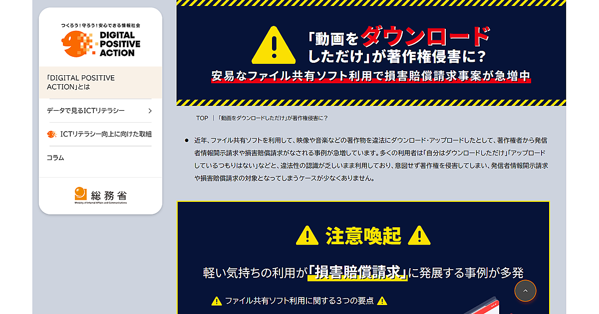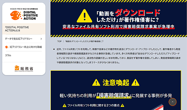 総務省は11月7日、「ファイル共有ソフトの不適切な利用」に対してあらためて注意を呼びかけた。あわせてソフト利用者に対する注意喚起ページを、総務省「DIGITAL POSITIVE ACTION」サイト内で公開している。