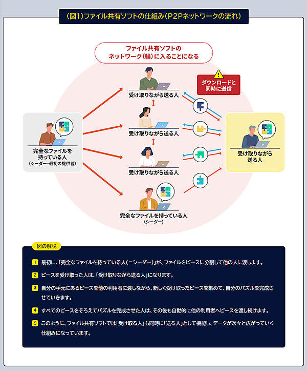 総務省は、「多くのファイル共有ソフトでは、ダウンロードと同時に自動でアップロードを行われる」「著作権者の許諾のないダウンロード・アップロードは著作権法違反に当たる場合がある」「氏名・住所が開示され、損害賠償請求の対象になるケースが多発している」などから、あらためて注意を呼びかけたとしている。