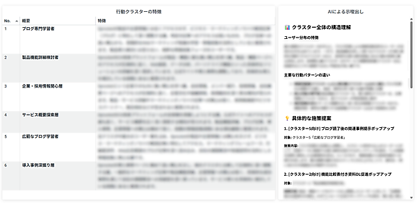 デジタルマーケティングで重要になるペルソナ(典型的なユーザー像)設計やセグメント施策を行う際、性別や年齢といった属性情報だけではサイトでの行動実態が十分に反映できない課題があったため、行動クラスター分析を実装。機械学習とAIの活用で、データ分析の専門知識がなくても「何を見たか」「どう行動したか」という実行動データに基づいたユーザーの分類が可能になる。