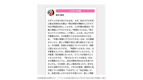 ターゲット分析で得たペルソナ(典型的なユーザー像)情報を入力すると、数クリックでAIがバーチャル生活者を生成する。複数のバーチャル生活者を設定し、チャット形式での同時会話も可能。さまざまな視点からの意見が分かる。画像や動画の提示で意見を聞くこともできる。マーケティング・コミュニケーション戦略の立案、商品コンセプトの開発、コミュニケーション施策開発に生かせる。