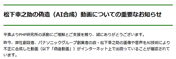 PHP研究所は、同社創設者である故・松下幸之助氏(パナソニックグループ創業者)の画像や音声をAI技術で不正に合成した「偽造動画(ディープフェイク)」がインターネット上で出回っていることを確認したと発表した。