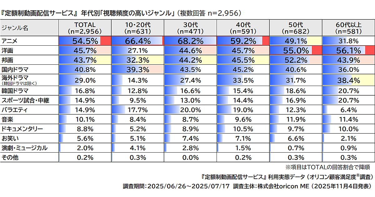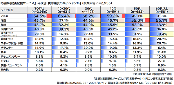 10~40代は「アニメ」、50~60代は「洋画」が最多