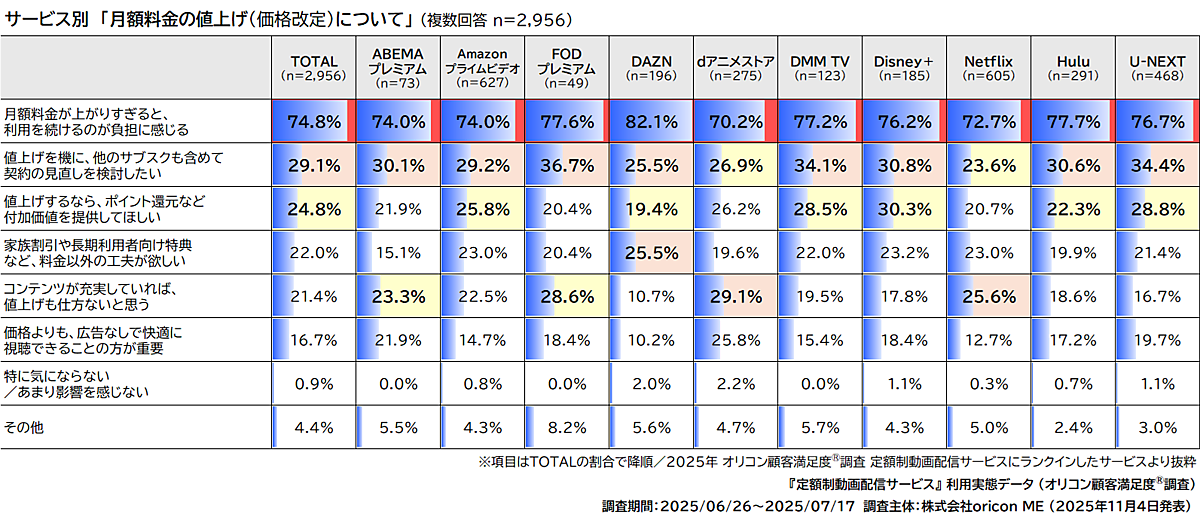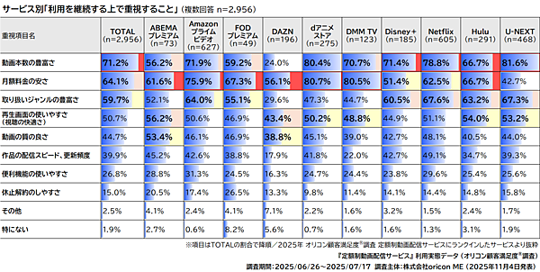 オリコンは、「定額制動画配信サービス」に関する調査結果を発表した。oricon MEが実施した「2025年 オリコン顧客満足度調査 定額制動画配信サービス」ランキングの調査対象者2956人に別途聴取しデータを集計分析している。