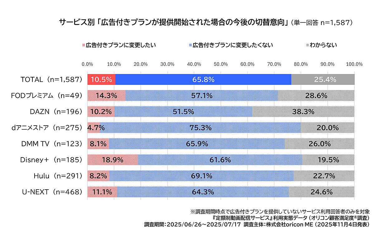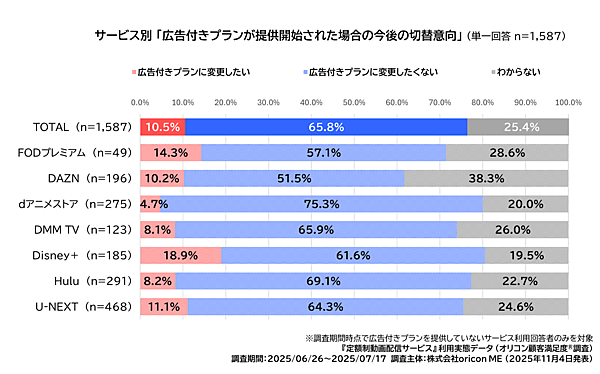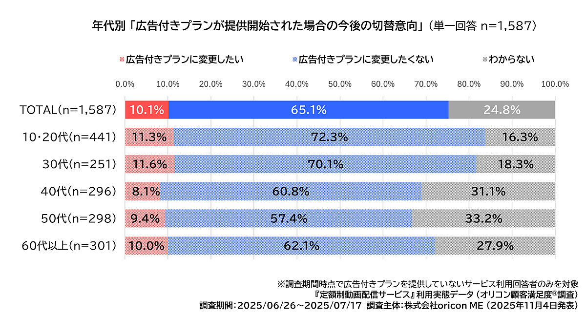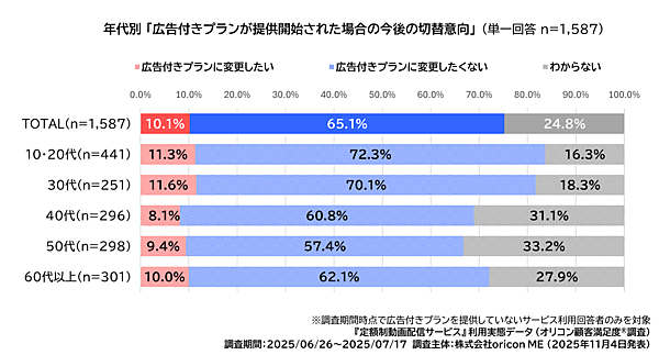つづいて、調査期間の時点で広告付きプランを提供していないサービス利用者1587人を対象に「広告付きプランが提供開始された場合の今後の切替意向」を聞くと、「広告付きプランに変更したくない」が6割以上。没入感を損なうなど視聴体験がデメリットだけでなく、特に若年層が多いためコスパ重視も感じさせる。サービス別では、dアニメストア利用者に「変更したくない」75.3%がもっとも多かった。
