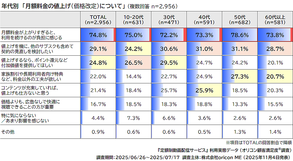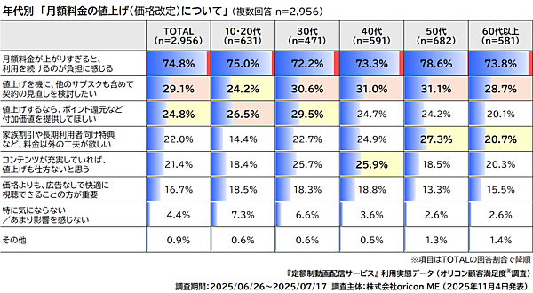 さらに「月額料金の値上げ(価格改定)に対する感想」を聞き年代別で見ると、「月額料金が上がりすぎると、利用を続けるのが負担に感じる」がすべての年代で7割超。10・20代では「値上げするなら、ポイント還元など付加価値を提供してほしい」が続き、30代・40代・50代・60代以上では「値上げを機に、他のサブスクも含めて契約の見直しを検討したい」が続いた。3位には40代で「コンテンツが充実していれば、値上げも仕方ないと思う」が、50代と60代以上では「家族割引や長期利用者向け特典など、料金以外の工夫が欲しい」がランクインした。