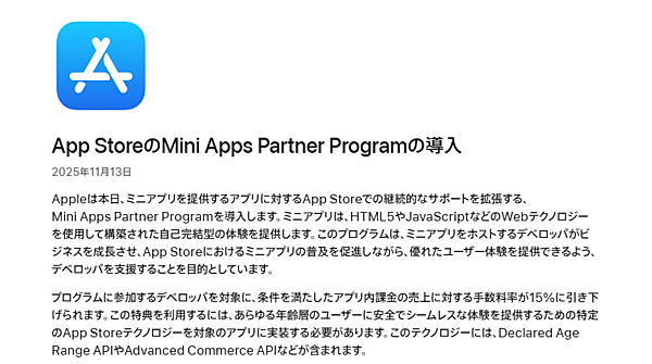 Appleは11月13日、アプリ配信サービス「App Store」で「Mini Apps Partner Program」を導入する発表した。Web技術の「HTML5」や「JavaScript」等を活用したミニアプリを提供するデベロッパーに対し、アプリ内課金に対する「App Store手数料率」を従来の30%から半額の15%に引き下げた。
