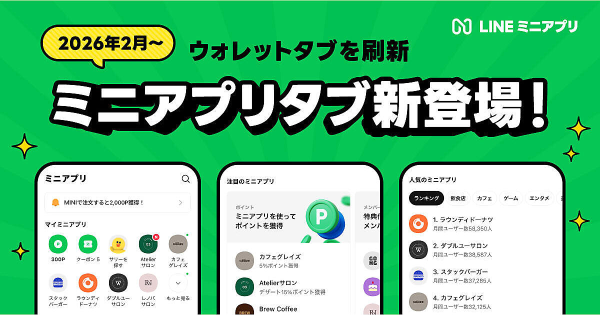 LINEヤフーは、同社のコミュニケーションアプリ「LINE」の「ウォレットタブ」を2026年2月ごろ刷新し、「ミニアプリタブ」として提供する、と11月17日発表した。機能の改善によって探す・見つける・繰り返すといった体験がLINE内でスムーズに完結できるようにする。ウォレットタブはLINEの画面右下にある金融サービスを集約したタブで、ポイントやクーポンの情報も受け取れる。