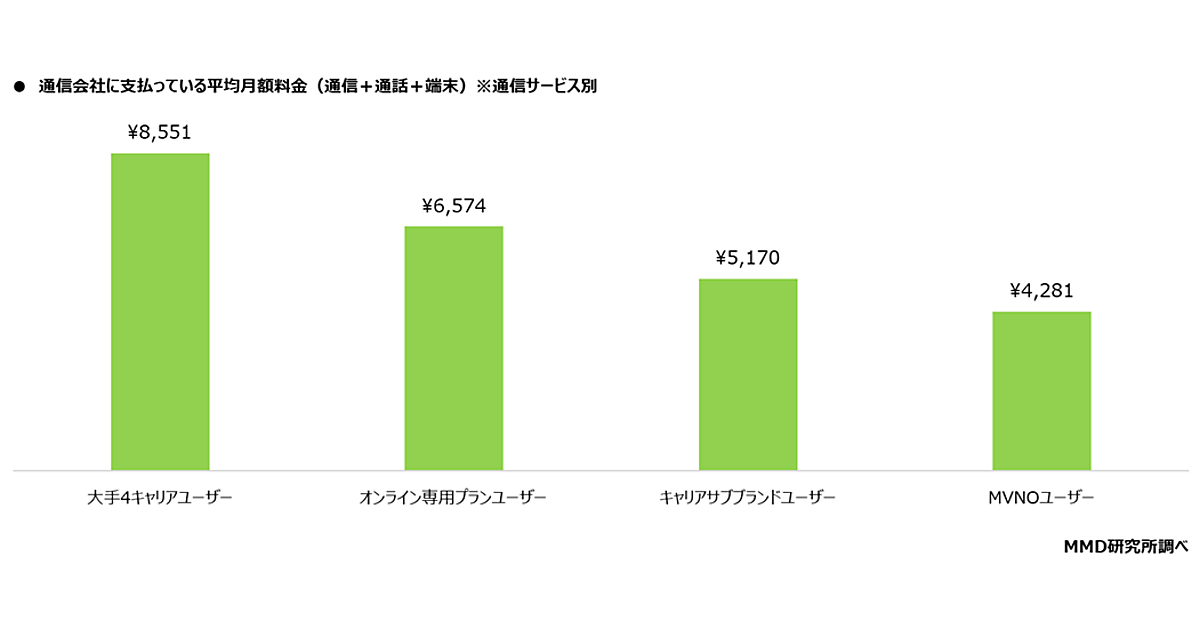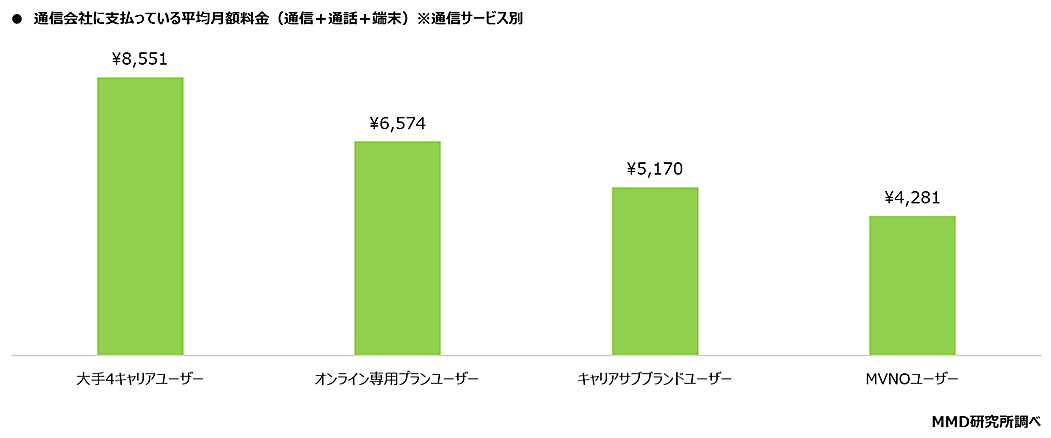そこで、通信契約している通信会社に支払っている「月額料金」(通信+通話+端末の料金の総計)を把握している人にその金額を聞くと、平均月額料金は大手4キャリアユーザー「8551円」、オンライン専用プランユーザー「6574円」、キャリアサブブランドユーザー「5170円」、MVNOユーザー「4281円」となった。