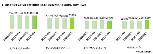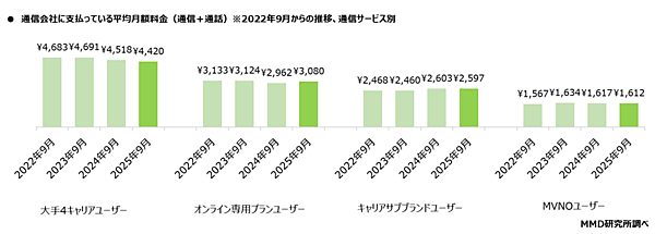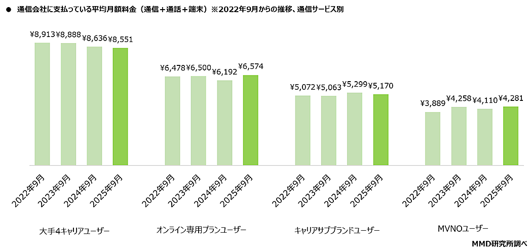 2024年9月の調査と比較すると、大手4キャリアユーザーは85円減少、オンライン専用プランユーザーは382円増加、キャリアサブブランドユーザーは128円減少、MVNOユーザーは171円増加している。
