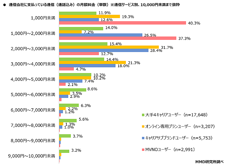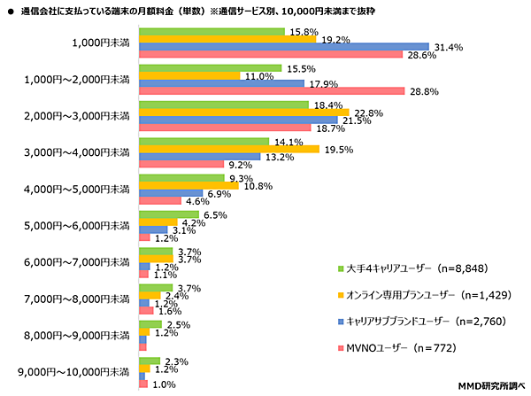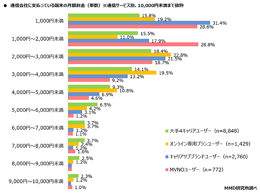 次に「端末の料金」(月々の割賦料金)について分割支払いしている2万481人に聞くと、大手4キャリアユーザーは「2000円~3000円未満」18.4%が最多で、平均額は「4131円」。オンライン専用プランユーザーは「3494円」、キャリアサブブランドユーザーは「2574円」、MVNOユーザーは「2669円」だった。