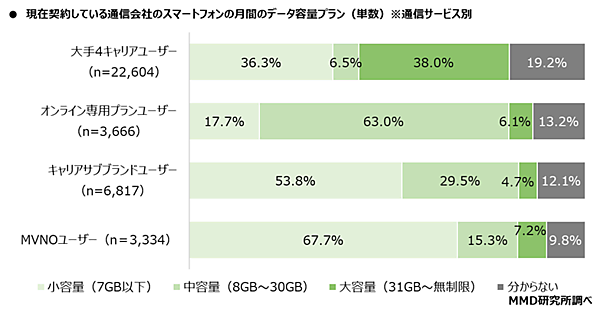 参考として「月間のデータ容量プラン」を聞くと、大手4キャリアは「大容量(31GB~無制限)」38.0%が多いが、オンライン専用プランは「中容量(8GB~30GB)」63.0%、キャリアサブブランドとMVNOは「小容量(7GB以下)」53.8%、67.7%が突出して多かった。