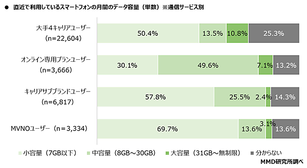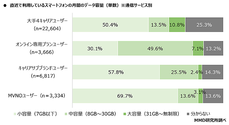 一方で「直近で利用したスマートフォンの月間データ容量」については、大手4キャリアとキャリアサブブランド、MVNOが「小容量(7GB以下)」50.4%、57.8%、69.7%が最多。オンライン専用プランのみ「中容量(8GB~30GB)」49.6%が最多だった。大手4キャリアユーザーは利用データ容量にあったプランを見直すことで、料金を最適化できそうだ。