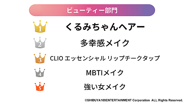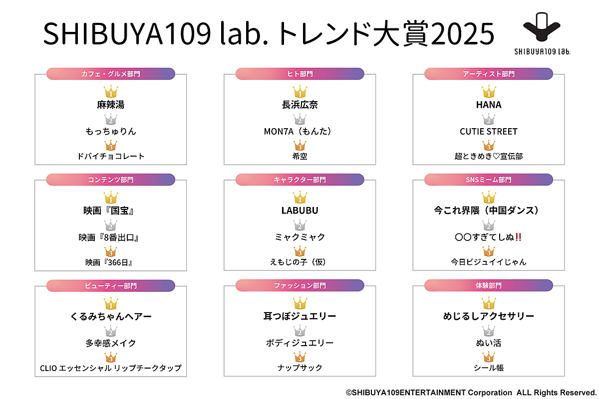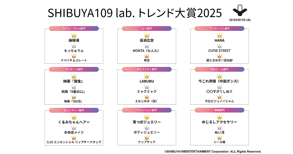 SHIBUYA109エンタテイメントが運営する若者マーケティング機関「SHIBUYA109 lab.」は、「SHIBUYA109 lab.トレンド大賞2025」を発表した。15~24歳女性619人が回答している。