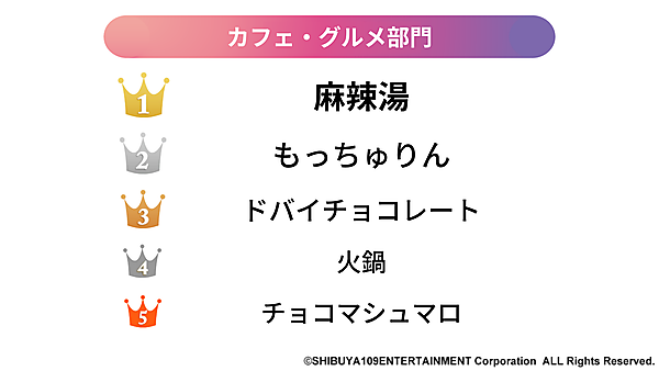 カフェ・グルメ部門では、中国・四川発祥のスープ料理「麻辣湯」が1位に。韓国・中国を中心としたヘルシーなアジアフードがトレンドとなった。2位はミスタードーナツの創業55周年記念商品「もっちゅりん」、3位はピスタチオペーストにカダイフ(小麦粉でできた細い麺)を入れたザクザクとしたチョコレート「ドバイチョコレート」となった。