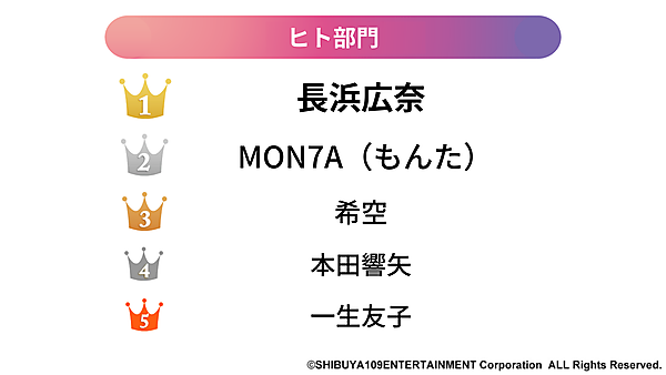 ヒト部門では、ABEMAで配信されている恋愛リアリティーショー『今日、好きになりました。』の出演者が多数ランクイン。1位は「おひなさま」という愛称で親しまれている「長浜広奈」、2位は机の上に足を上げて撮影する動画が「もんた界隈」として話題になった「MON7A(もんた)」が入った。