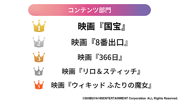 コンテンツ部門では、吉沢亮主演の映画『国宝』が1位に。生い立ちも才能も異なる2人の登場人物が歌舞伎の世界で生きる姿を描いた作品で、完成度が高く評価された。2位は昨年話題となったゲーム『8番出口』を元にした実写映画『8番出口』。3位は4人組バンドであるHYの楽曲『366日』に着想を得た映画『366日』だった。