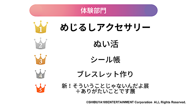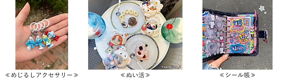 体験部門では、主にガチャガチャの景品としてゲットできる「めじるしアクセサリー」がトップに。小さなチャームを傘の柄やリップなどにつけて楽しまれている。2位はお気に入りのぬいぐるみとお出かけしたり、写真を撮ったりする「ぬい活」、3位はシールのコレクションや友達とのシール交換を楽しむ「シール帳」となった。