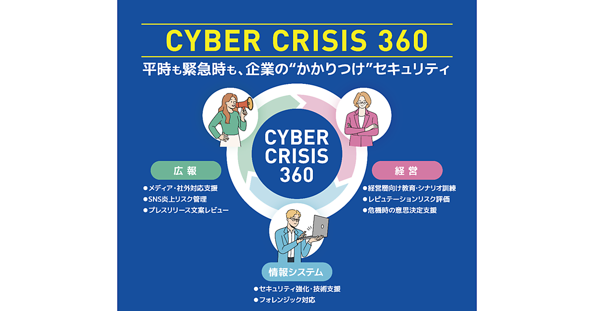 電通グループでPR事業の電通PRコンサルティング(電通PRC)と、電通グループのシンクタンクの電通総研は、企業のサイバーセキュリティ分野の総合サービス「CyberCrisis(サイバークライシス)360(CC360)」を11月17日に始めた、と同日発表した。サイバーセキュリティの技術的支援に加え、緊急時と平時の経営、広報、情報システム部門が連携して対応する体制構築を支援する。