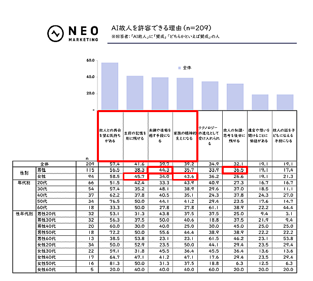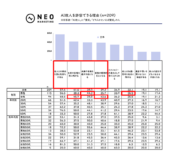 男女別で見ると、男性は「未練や後悔を癒す手段になる」「故人の知識・思考を後世に残せる」が高め、女性は「生前の記憶を形に残せる」「家族の精神的支えになる」が高めと、やや傾向に違いがある。