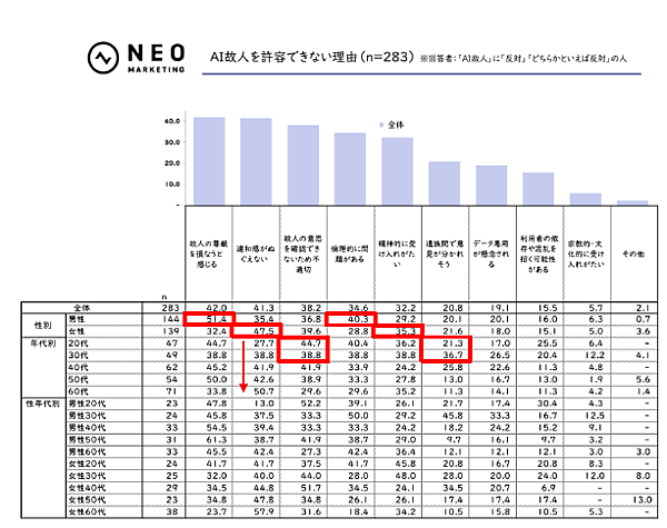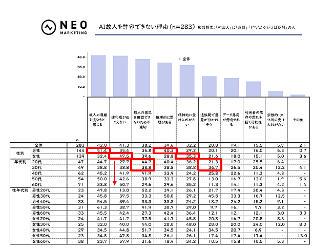 一方、AI故人を許容できない283人があげた「許容できない理由」では、「故人の尊厳を損なうと感じる」42.0%と「違和感がぬぐえない」41.3%がほぼ並んで多かった。