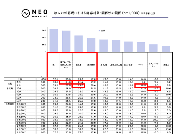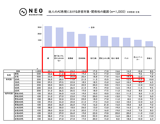 あらためて全体に「AI故人の再現の許容対象(関係性の範囲)」を聞くと、「親」32.1%が最多だが、「誰であっても受け入れられない」30.0%がほぼそれに並ぶ。性別では、男性は「誰であっても受け入れられない」が高いが、女性は「配偶者」が高い。また女性は「ペット」18.8%が男性の9.2%のほぼ倍に達した。