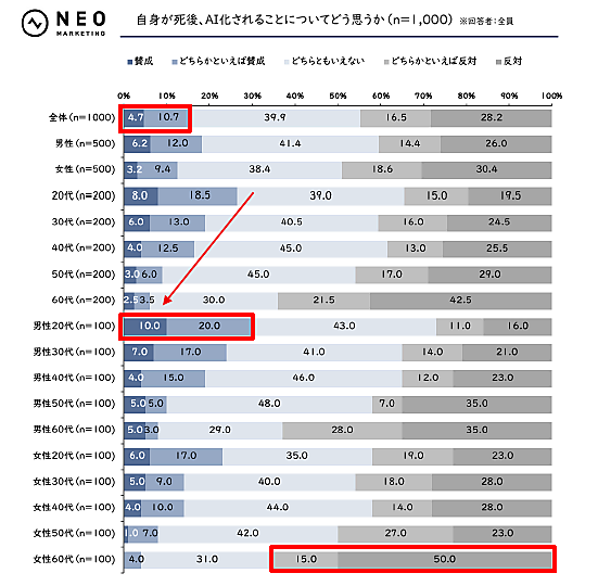 最後に「自身が死後、AI化されることについてどう思うか」を聞くと、賛成派(賛成+どちらかといえば賛成)は15.4%にとどまり、反対派(反対+どちらかといえば反対)は44.7%と多数。年代別では若年層ほど前向きで、性年代別では男性20代の賛成派30.0%、女性60代の反対派65.0%が目立つ。