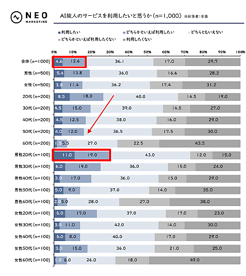 なお「AI故人のサービスを利用したいと思うか」については、17.2%が前向きで、若年層ほどAI故人に対しポジティブで、男性20代では30.0%にまで達している。